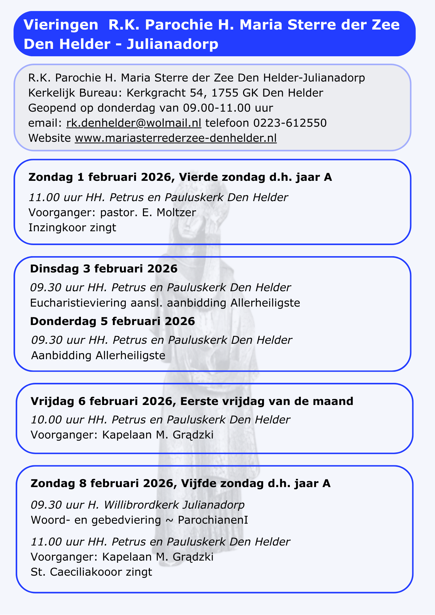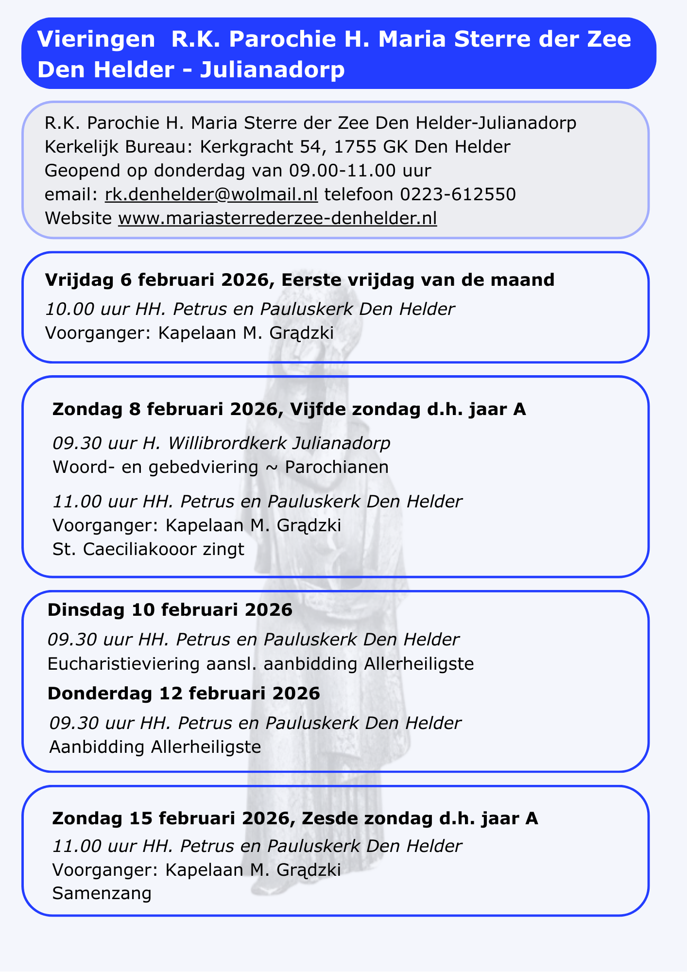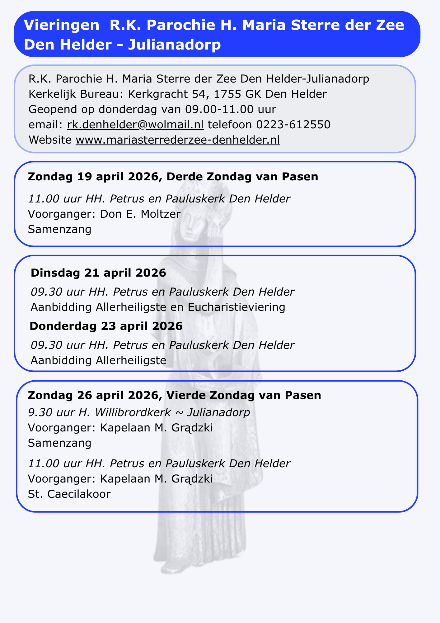 ![]() | Welkom op de website van de R.K. Parochie Heilige Maria, Sterre der Zee in Den Helder en Julianadorp. Deze parochie omvat de twee Rooms Katholieke kerken in Den Helder. Dat zijn de Petrus en Pauluskerk in het stadsdeel Centrum en de H. Willibrordkerk in Julianadorp. Voor specifieke informatie over de Willibrordkerk is een aparte website beschikbaar. |