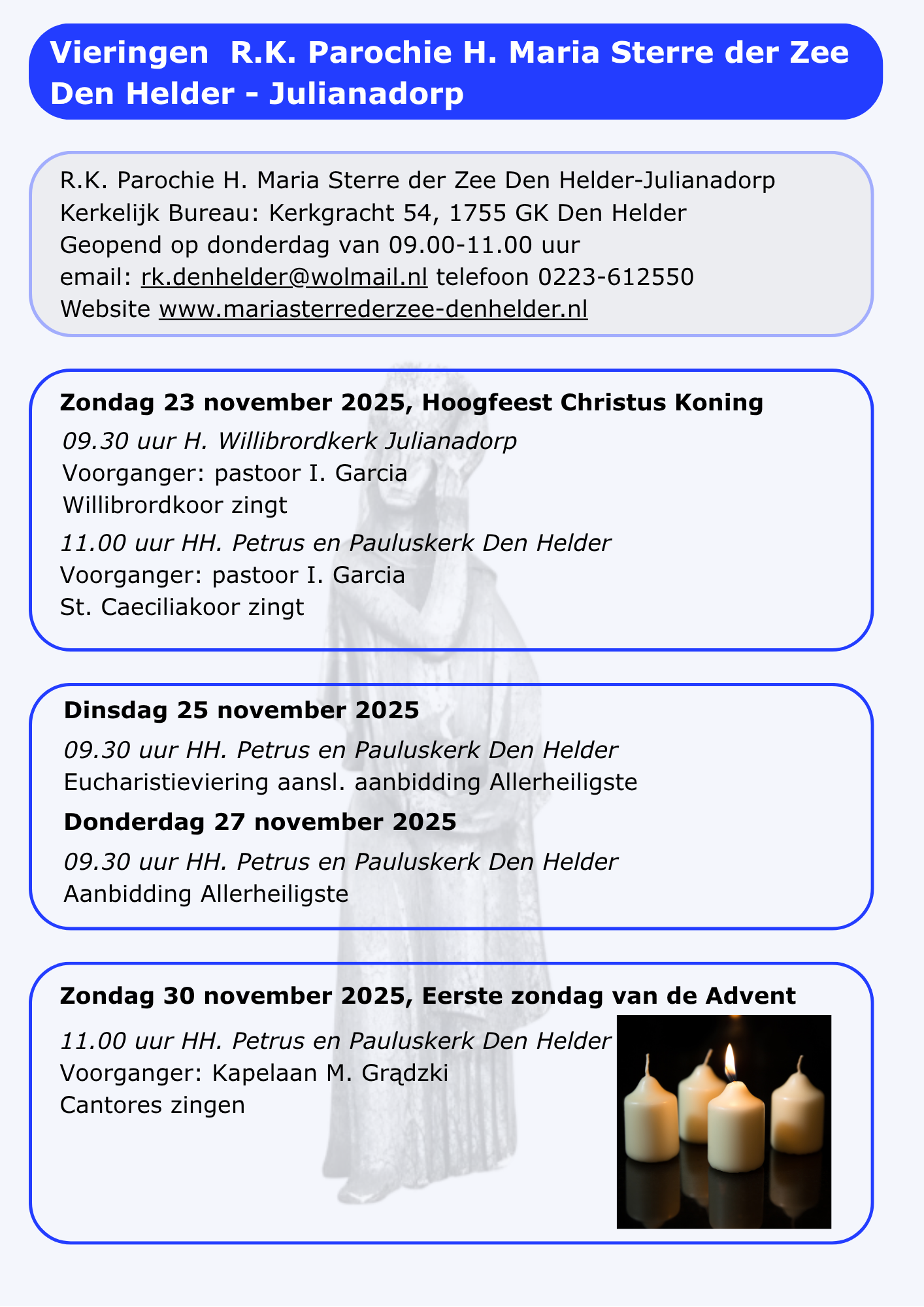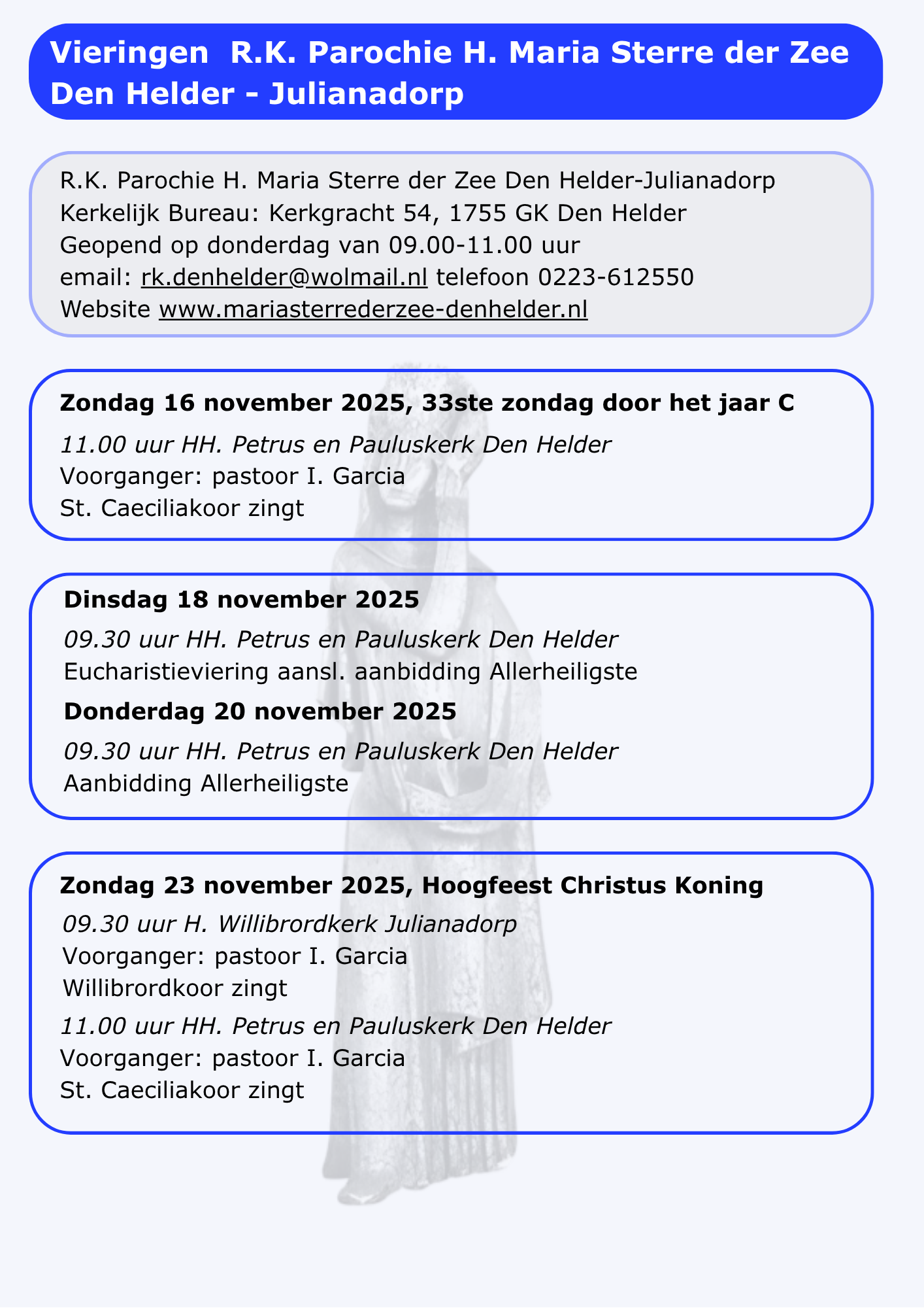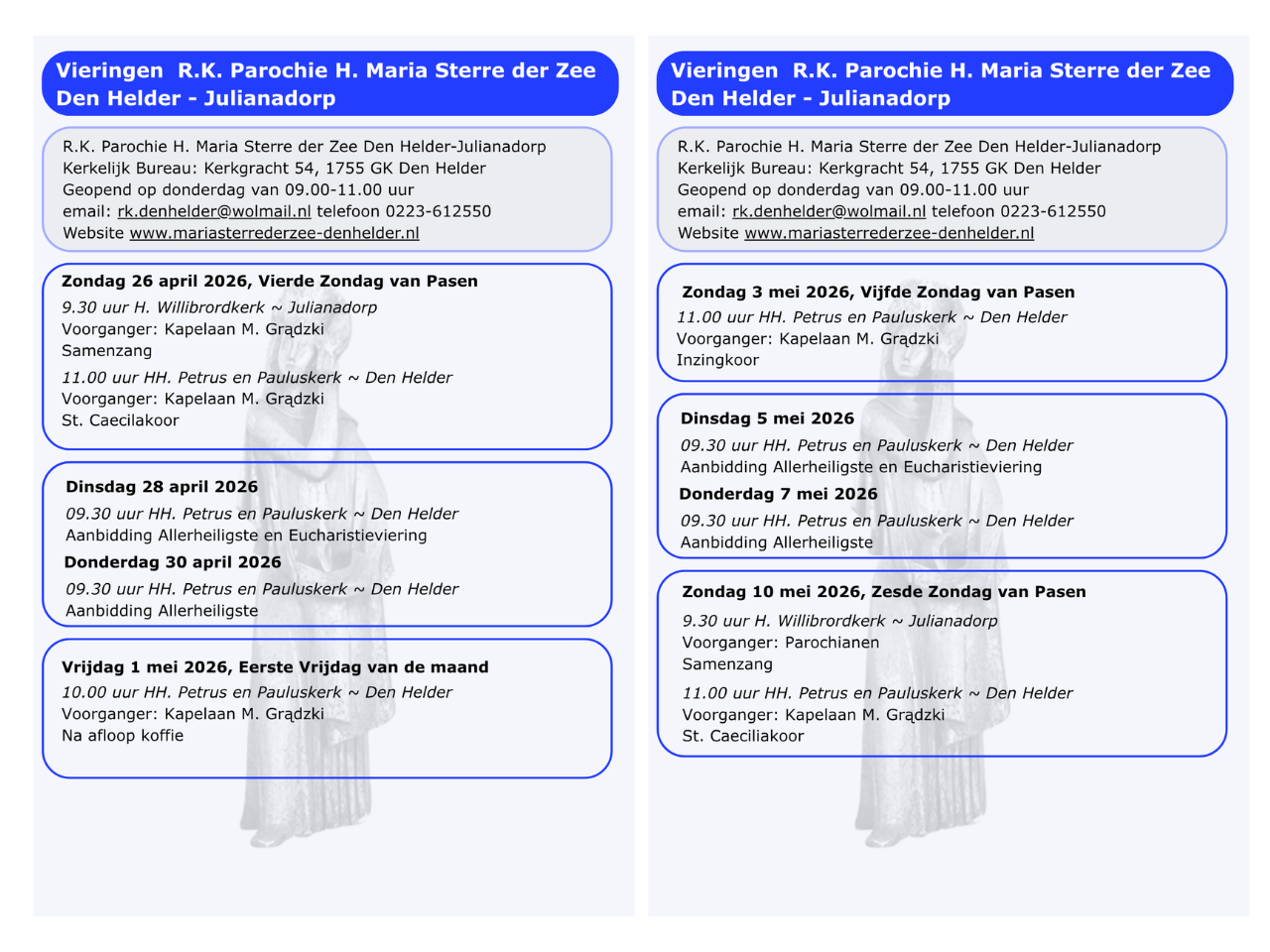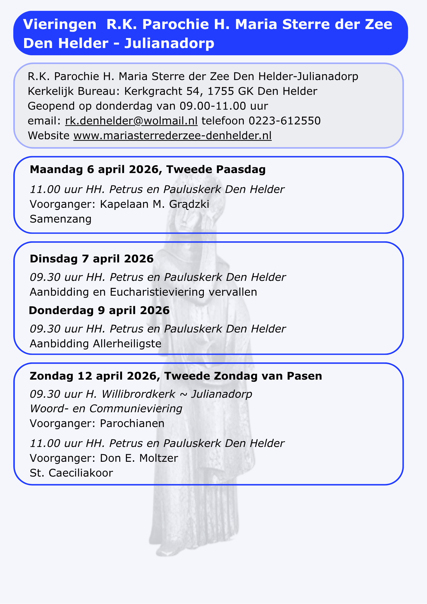 ![]() | Welkom op de website van de R.K. Parochie Heilige Maria, Sterre der Zee in Den Helder en Julianadorp. Deze parochie omvat de twee Rooms Katholieke kerken in Den Helder. Dat zijn de Petrus en Pauluskerk in het stadsdeel Centrum en de H. Willibrordkerk in Julianadorp. Voor specifieke informatie over de Willibrordkerk is een aparte website beschikbaar. |