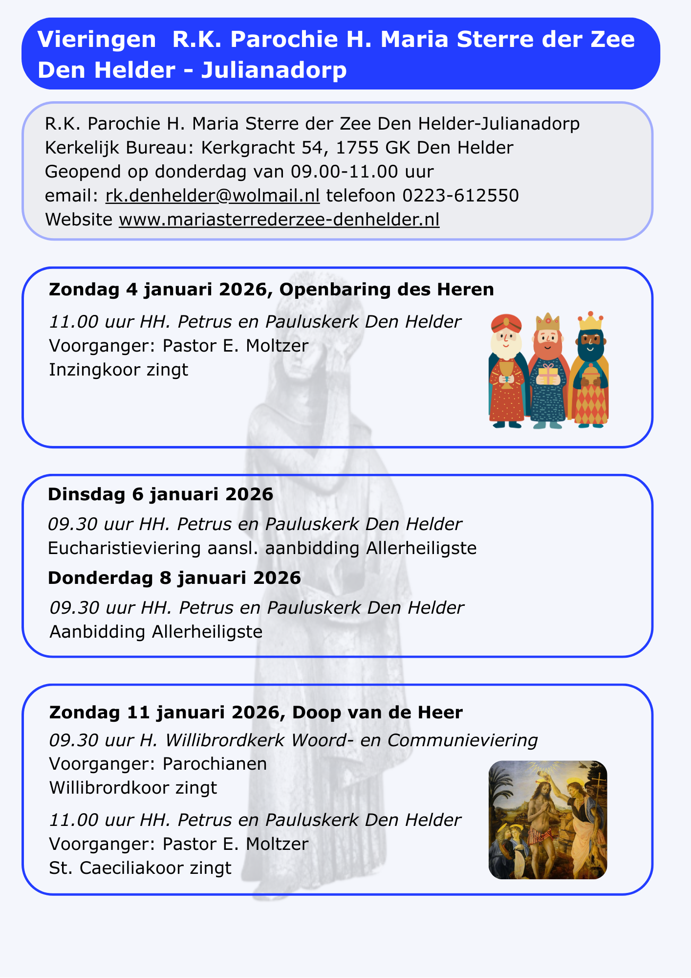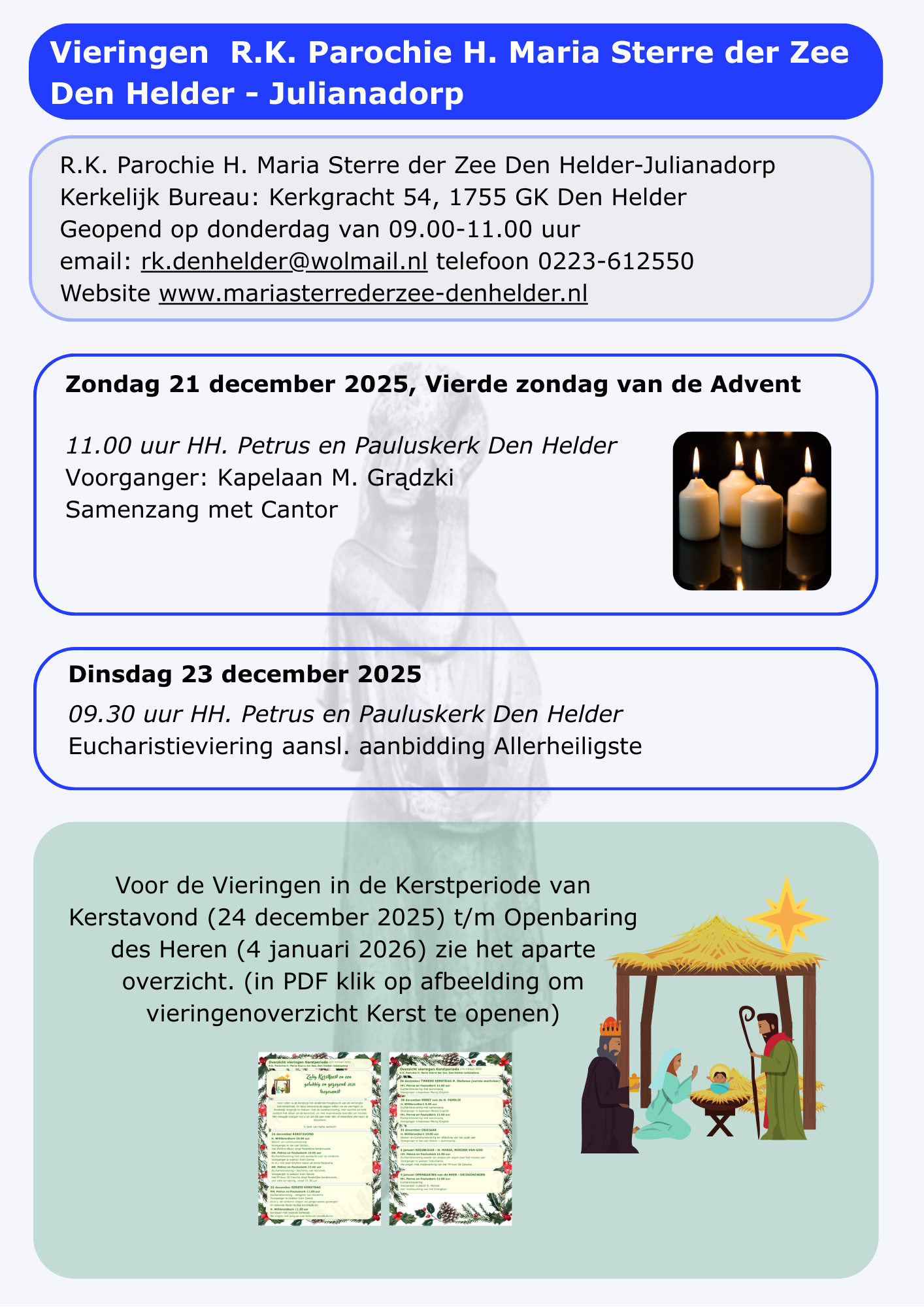 In dit overzicht vindt u alle vieringen in de periode van Kerstavond t/m de Openbaring des Heren – Driekoningen (wordt in de parochie gevierd op 4 januari 2026).